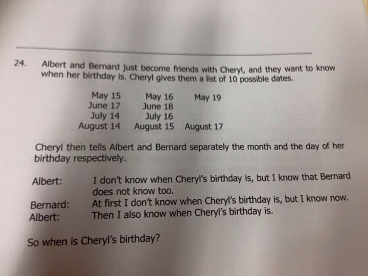 Cheryl só lhe pode ter dito 16, 15 ou 17, porque se lhe tivesse dito 14, ainda